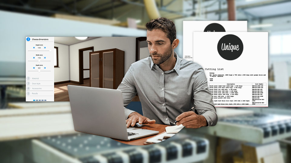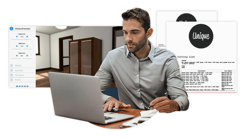 • Cover letter, quote, BOM, and cut list documents are updated in real-time as the cupboard is configured.